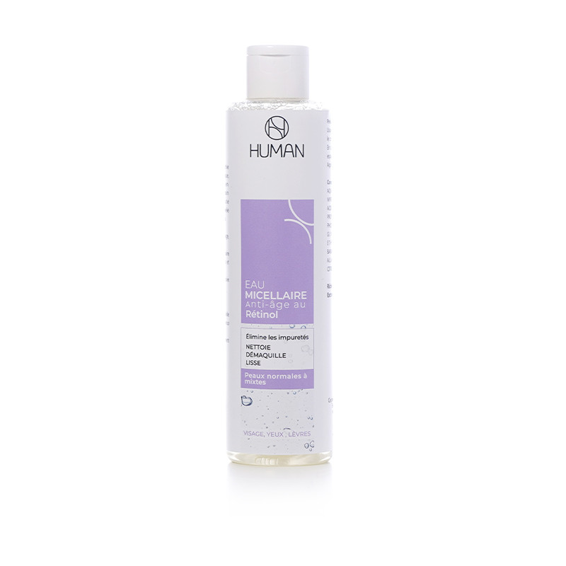 Eau Micellaire Au Rétinol Human nettoie la peau en profondeur tout en respectant sa sensibilité. Sa formule enrichie en actifs purifiants et apaisants élimine efficacement les impuretés, l’excès de sébum et les résidus de maquillage, sans dessécher ni irriter. Elle réduit l’apparition des boutons et des points noirs, tout en démaquillant en douceur le visage, les yeux et les lèvres. La peau est visiblement plus nette, hydratée et apaisée, sans film gras. Le teint est illuminé, rafraîchi et retrouve son éclat naturel.