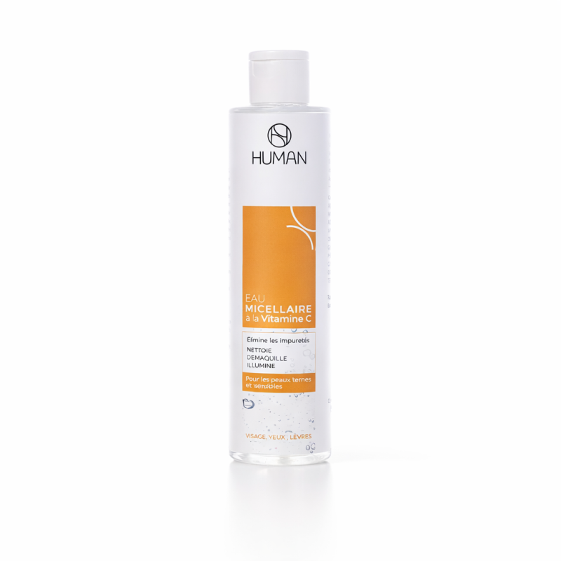 L'eau Micellaire riche en Vitamine C antioxydante, l’eau micellaire HUMAN est un soin nettoyant 3-en-1 qui démaquille le visage, les yeux et les lèvres, élimine l’excès de sébum et les impuretés, tout en révélant l’éclat naturel de la peau. Sa formule douce hydrate, apaise et tonifie sans laisser de film gras, offrant une peau propre, fraîche et lumineuse, idéale pour tous les types de peau, même sensibles.